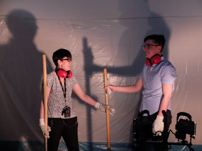 There are two shovels present, attached to each other so the single participant feels the physical/emotional weight of being alone.